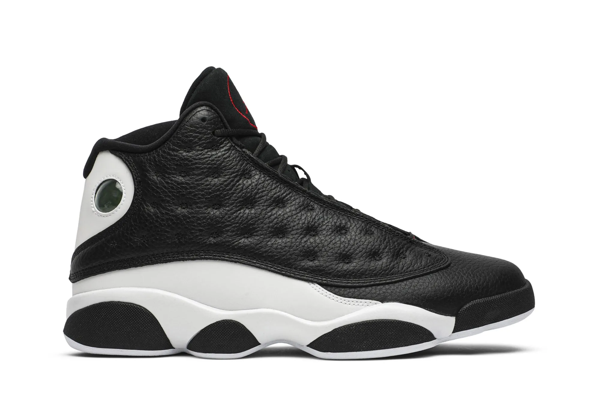 As its moniker suggests, the Air Jordan 13 Retro ‘Reverse He Got Game’ offers a flip on the OG colorway of the sneaker nominally associated with Spike Lee’s 1998 film. Basic black is applied to the mid-top’s tumbled leather toe and side panels, contrasted by a crisp white finish on the rest of the upper. Breaking up the two-tone palette is a green holographic ‘cat eye’ and a red Jumpman logo on the tongue.