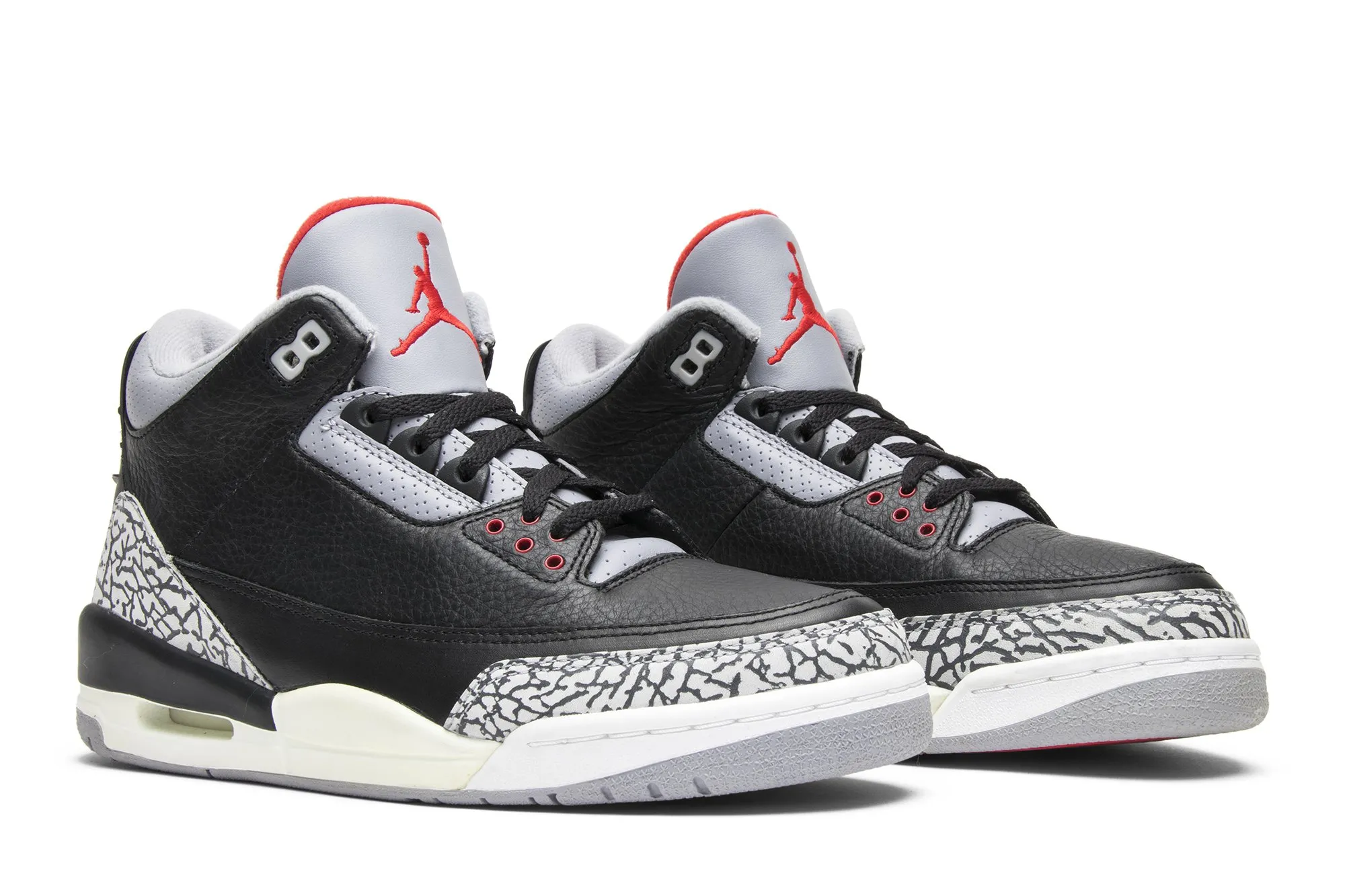 The Air Jordan 3 Retro 2001 brings back a classic in the original colors from 1988 including the Nike Air logo on the heel. This shoe also features a black leather upper with perforated grey details on the eyestay and collar lining, and solid Cement Grey details on the tongue. The sneaker also sports the iconic elephant print on the mudguard and heel, University Red accents on the Jumpman logo and lower eyelets, and a partially encapsulated Air unit in the midsole for cushioning.