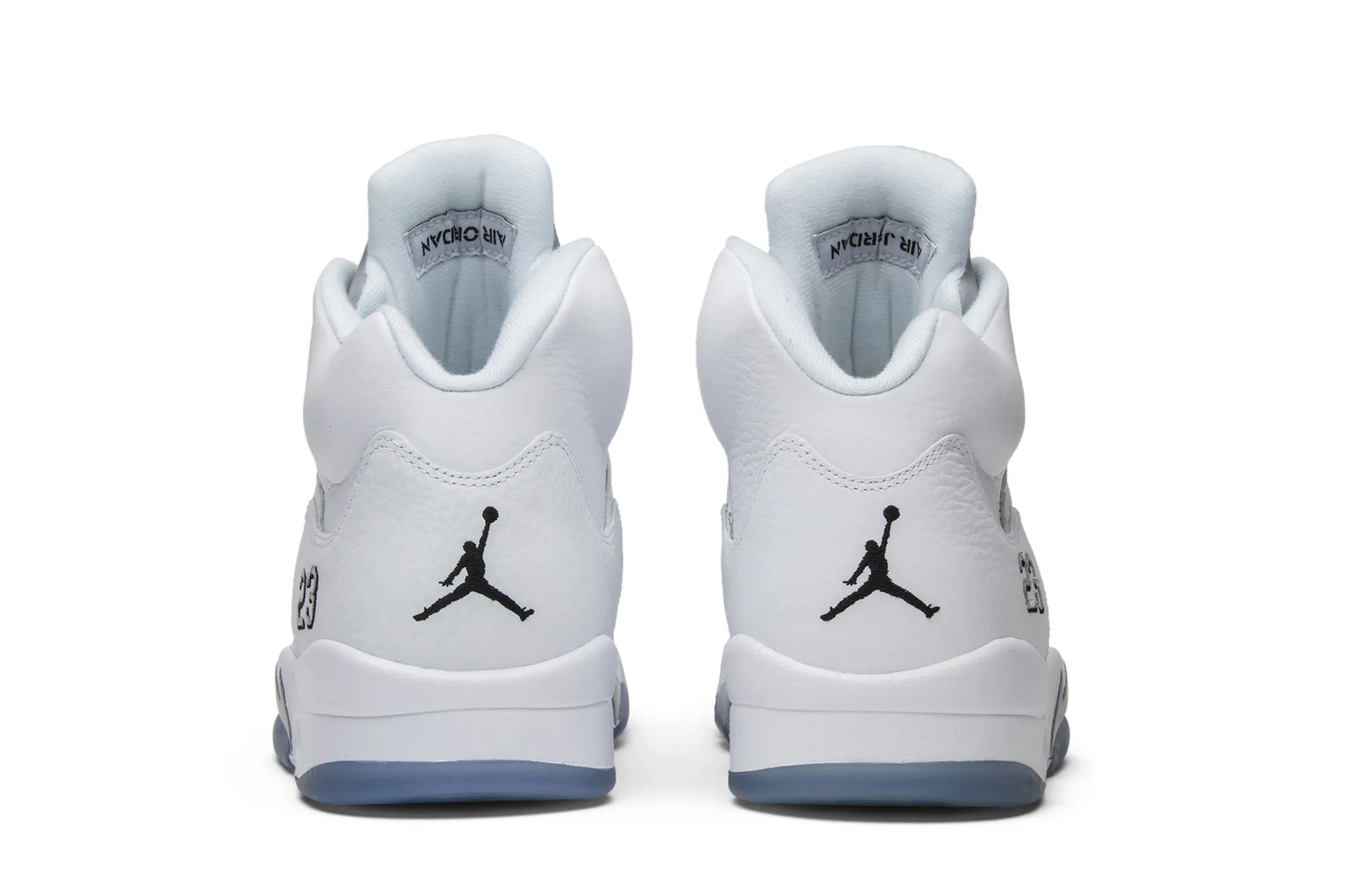 Released in April of 2015, the Air Jordan 5 Retro ‘Metallic White’ 2015 offers a remastered version of the colorway first released back in 2000. The sneaker has a white tumbled leather upper with metallic silver and black accents on an ice blue translucent outsole.