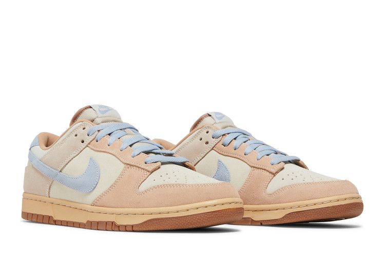 The Nike Dunk Low 'Sanddrift Armory Blue' features an upper that replaces traditional leather construction with a supple suede build, awash in cream and beige hues. Powder blue accents land on the Swoosh and back tab, marked with Nike branding in embroidered lettering. The low-top is mounted on a rubber cupsole, featuring stitched sidewall construction and an interior foam wedge for lightweight cushioning.