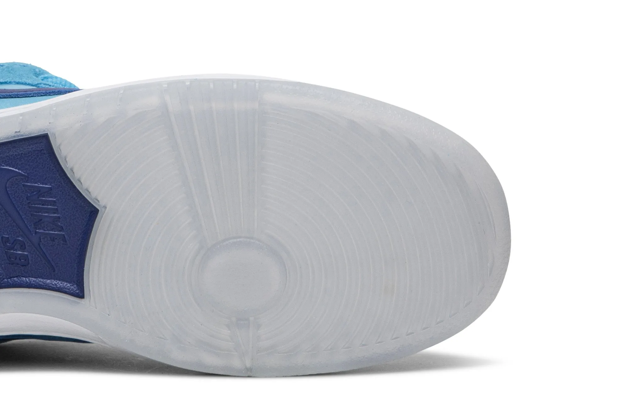 The Nike Dunk Low SB ‘Blue Fury’ showcases a vibrant blue finish on the upper, constructed from nubuck with tonal suede overlays. The sneaker’s signature Swoosh is rendered in royal blue leather, matching an embroidered Nike wordmark on a metallic silver heel tab. A padded mesh tongue combines with Zoom Air cushioning in the sockliner for enhanced comfort. The low-top rests on a resilient white foam midsole, supported underfoot by a translucent rubber outsole.