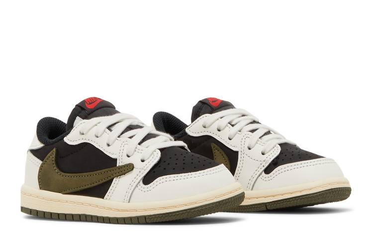 The Travis Scott x Air Jordan 1 Retro Low OG SP TD Olive delivers a scaled-down version of the foundational silhouette, accented with custom branding elements that have become synonymous with the Houston rapper. The low-top makes use of a black suede upper with off-white leather overlays and a reverse olive green Swoosh on the lateral side. Contrasting hits of crimson appear on woven Nike tongue tags and mismatched heel tabs marked with Cactus Jack and Jordan Wings branding. A vintage cream-colored finish is applied to the midsole, supported underfoot by an olive rubber outsole.