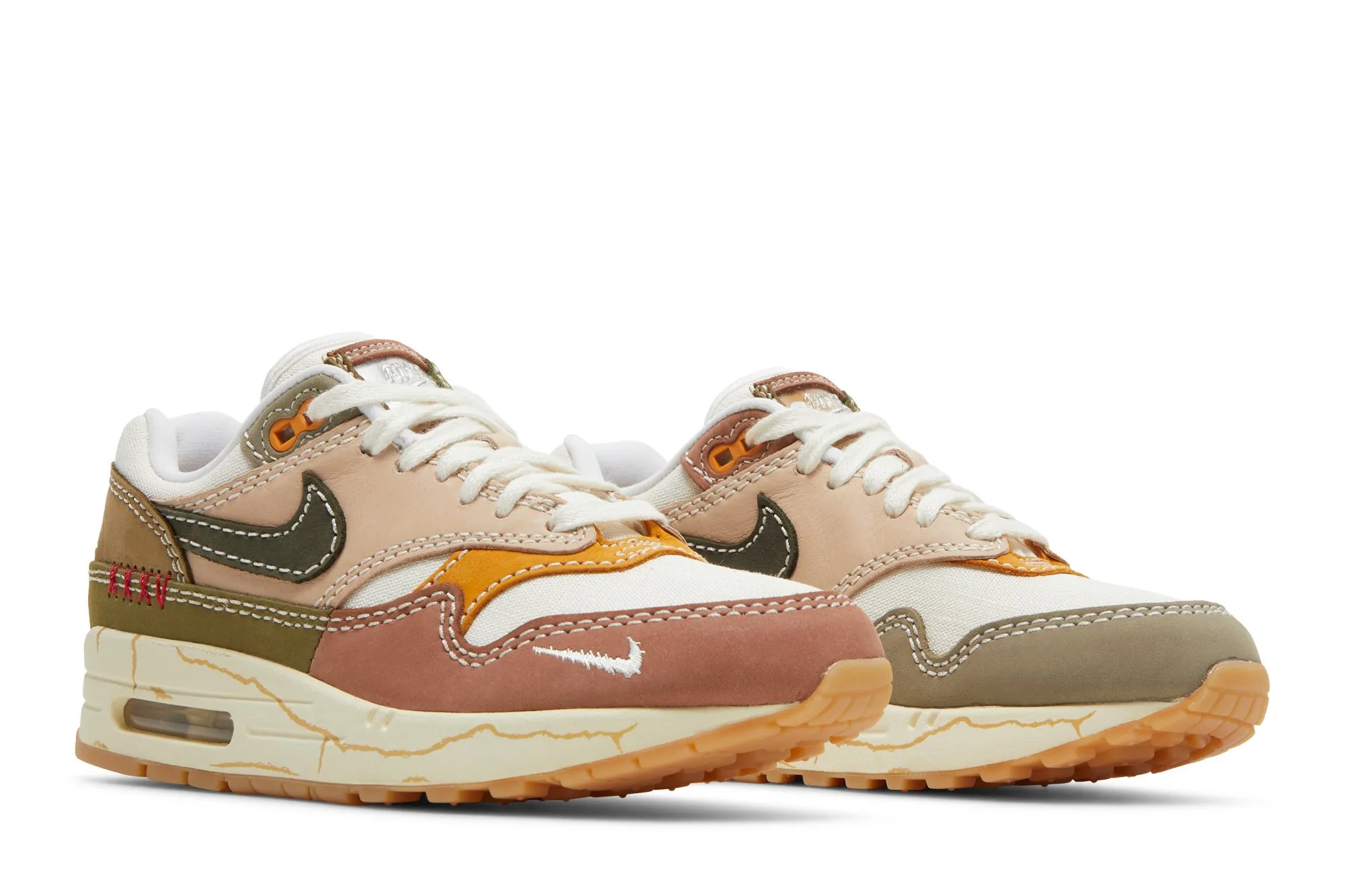 Launching exclusively in Asia Pacific and Latin America as part of Nikes 2022 Air Max Day lineup, the Nike Air Max 1 Wabi-Sabi gets its name from the Japanese philosophy of finding beauty in an objects flaws and imperfections. Exposed contrast stitching distinguishes the upper, featuring an off-white canvas base with a green Swoosh and a midfoot overly in pink leather. Asymmetrical color blocking in subdued shades of brown and olive is applied to the split mudguard and heel overlay, the latter accented with Nikes playful smiley face. XXXV is embroidered in red stitching on the lateral heel ‚ nodding to the shoes 35th anniversary ‚ while interchangeable tongue tags provide customized branding. The sneaker rides on a cream-colored midsole, finished with a crackle graphic and supported by a gum rubber outsole.